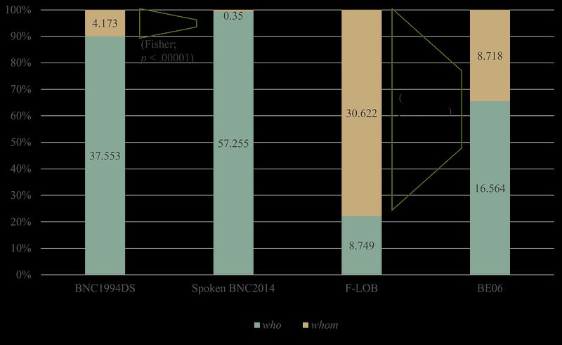 Normalised frequency per million words of relativisers who and whom after prepositions in spoken (first two columns) and written (last two columns) BrE corpora (Abalo-Dieste & Pérez-Guerra 2021: 61-62)